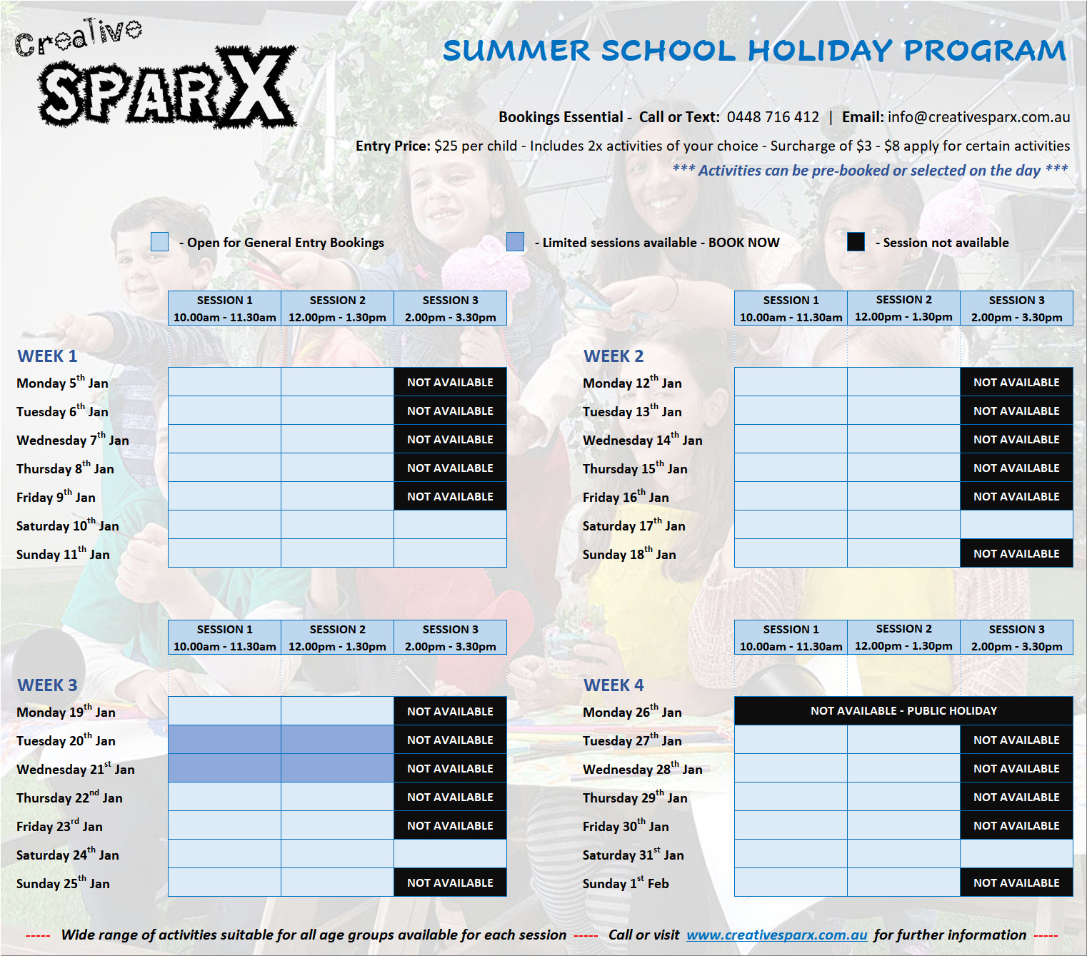For enquiries or to book a Birthday Party or School Holiday Activity Session, please call or text 0448 716 412 or email info@creativesparx.com.au.